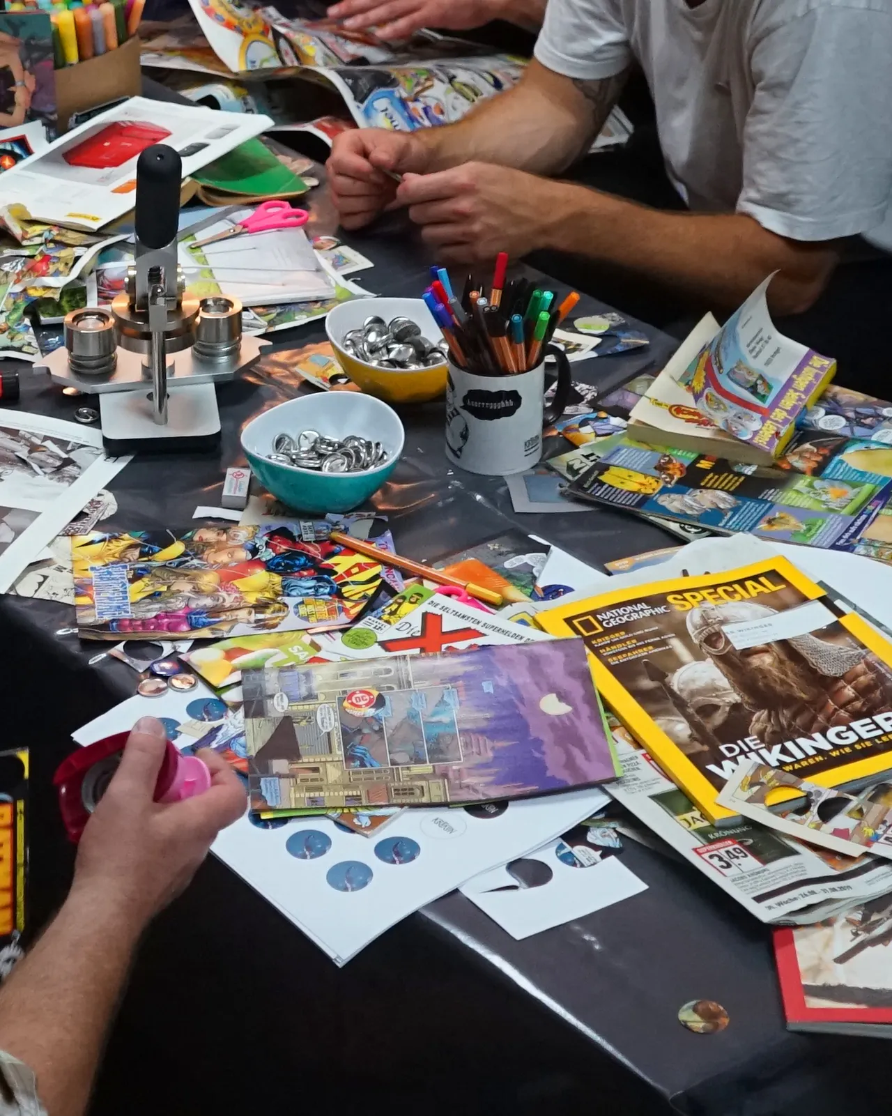 Dieses Jahr schippert der Kraken zum gegenüberliegenden Projektspeicher. Dort kann man sich im Keller an der Buttonmaschine austoben und in kreativer Gesellschaft seinen individuellen Anstecker gestalten.